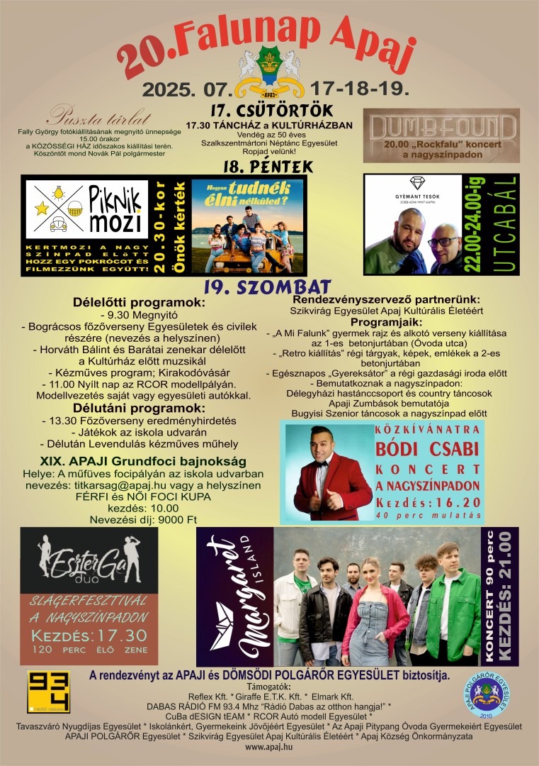 Apaj egyik legnagyobb és leginkább várt rendezvénye, amelyet minden évben megtartanak. A Falunap általában több napon át tart, koncertekkel, vetélkedőkkel és egyéb közösségi programokkal.