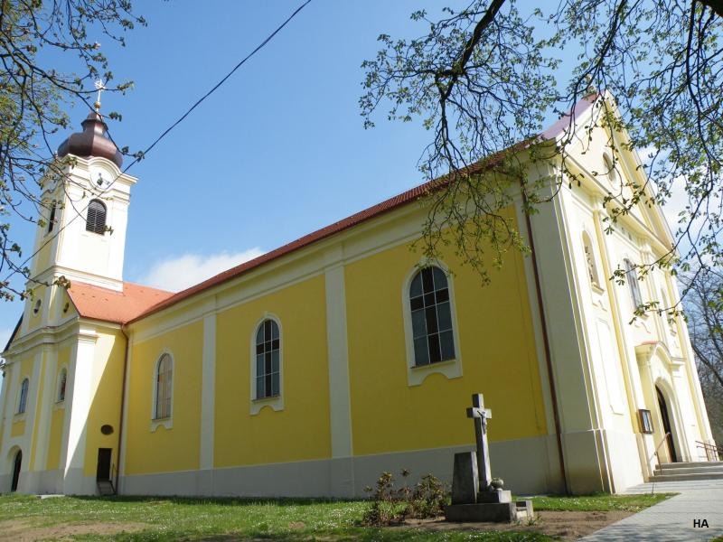 A Szabadság tér északi részén, a Várdombnak nevezett emelkedőn áll a település barokk stílusú temploma. A római katolikus imahely 1790-ben épült, belső terét Merész Gyula freskói töltik ki. Itt található a Somssich-család kriptája is, melynek mozaik díszítését 1920-ban készítette Mezei Müller Gyula festőművész.